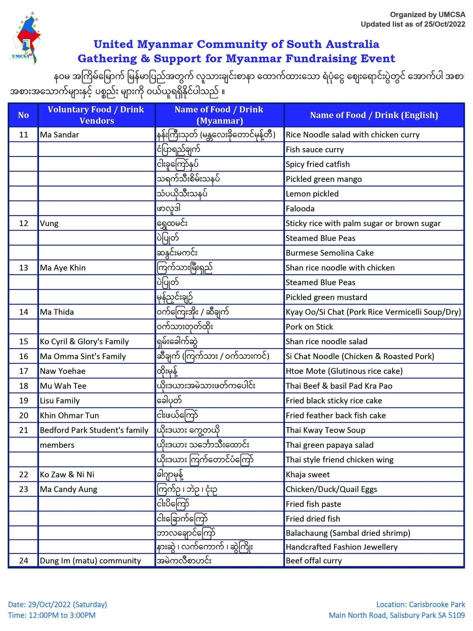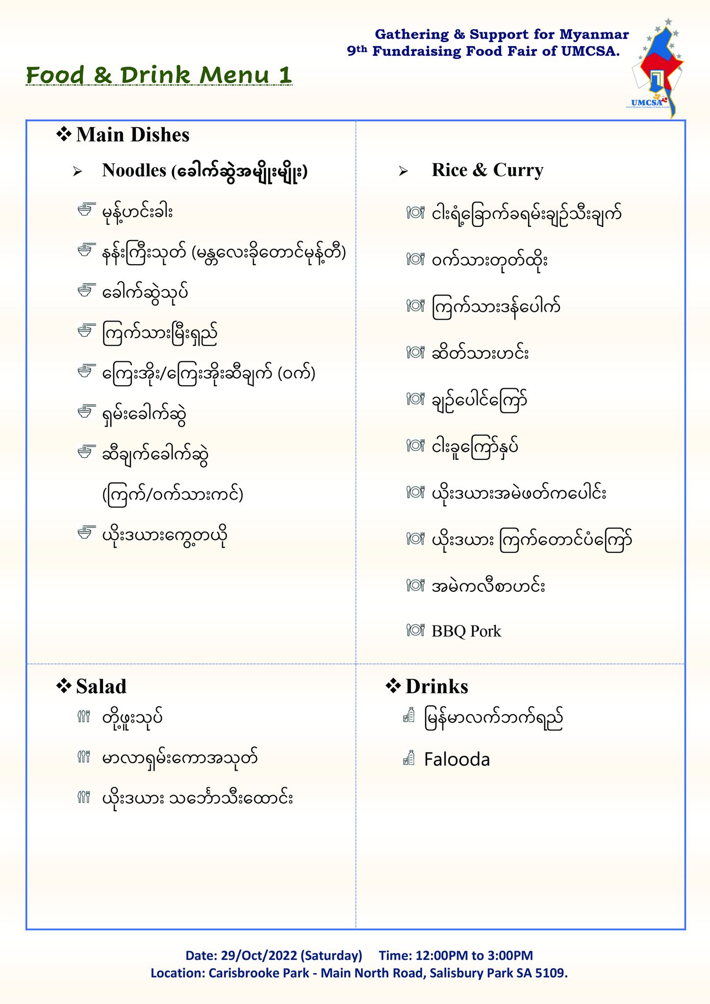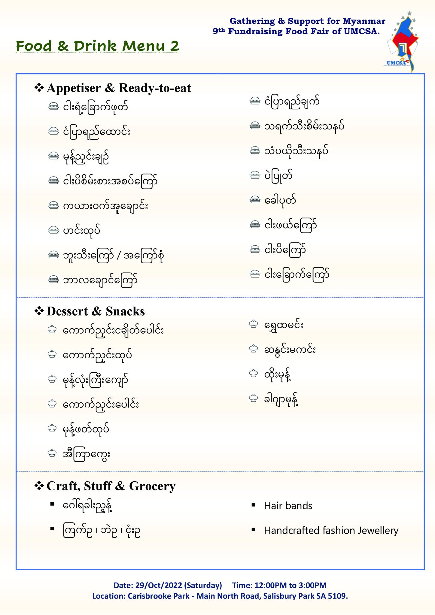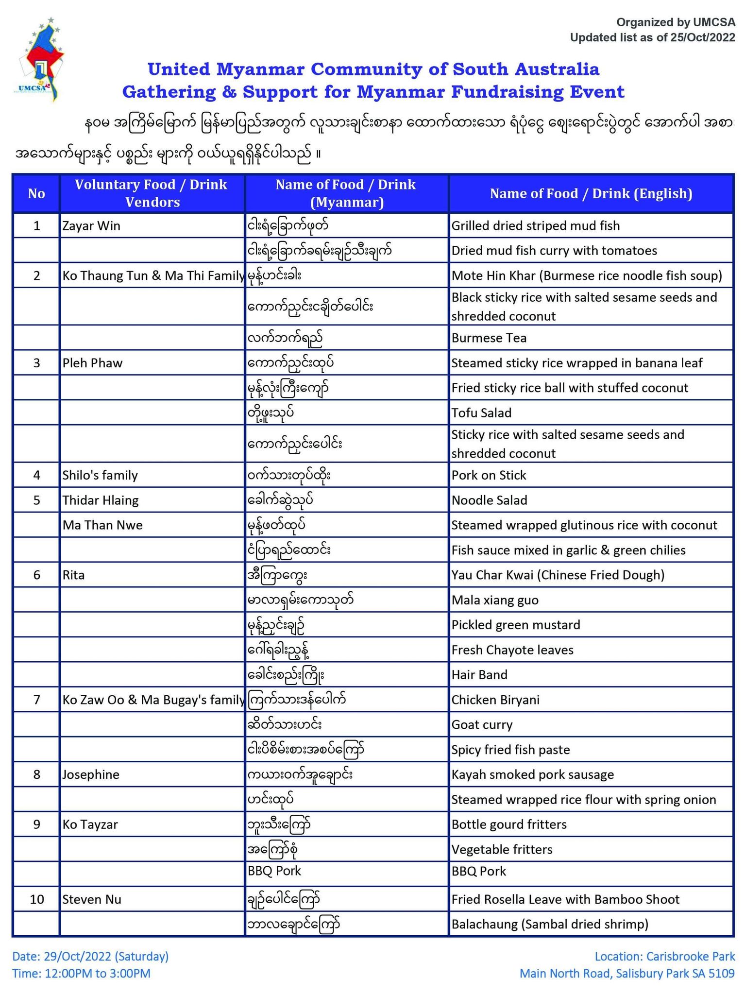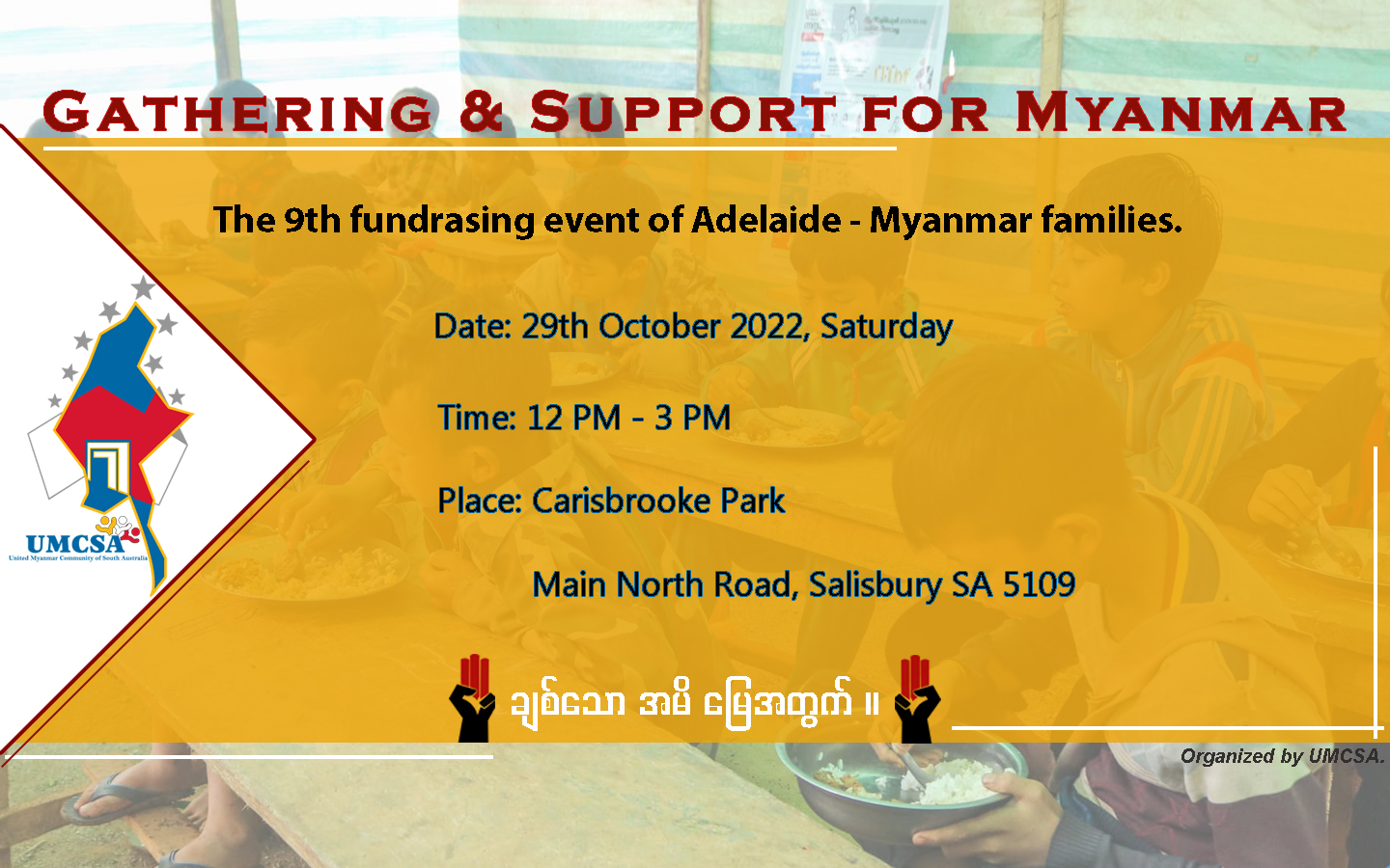The United Myanmar Community of South Australia will host the 9th Gathering and Fundraising Food Fair on Saturday 29th October 2022 to raise funds and awareness for their community’s fight for democracy in their home country of Myanmar.