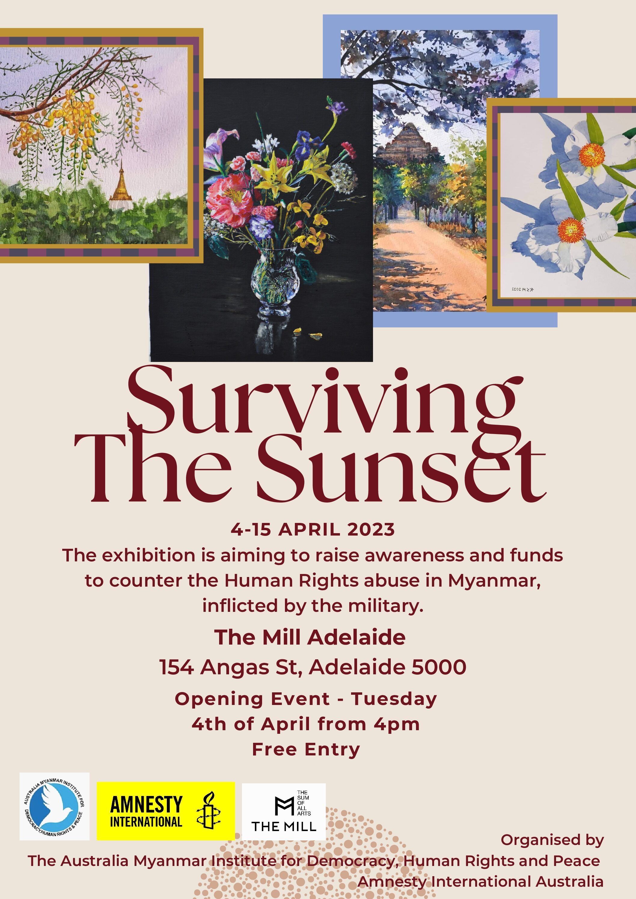 From April 4th to 15th, 2023, The Mill on Angus Street in Adelaide will host the "Surviving the Sunset" fundraising art exhibition, organized by the Australian Myanmar Institute for Democracy, Human Rights and Peace Limited (AMIDHRP) and Amnesty International Australia SA/NT.